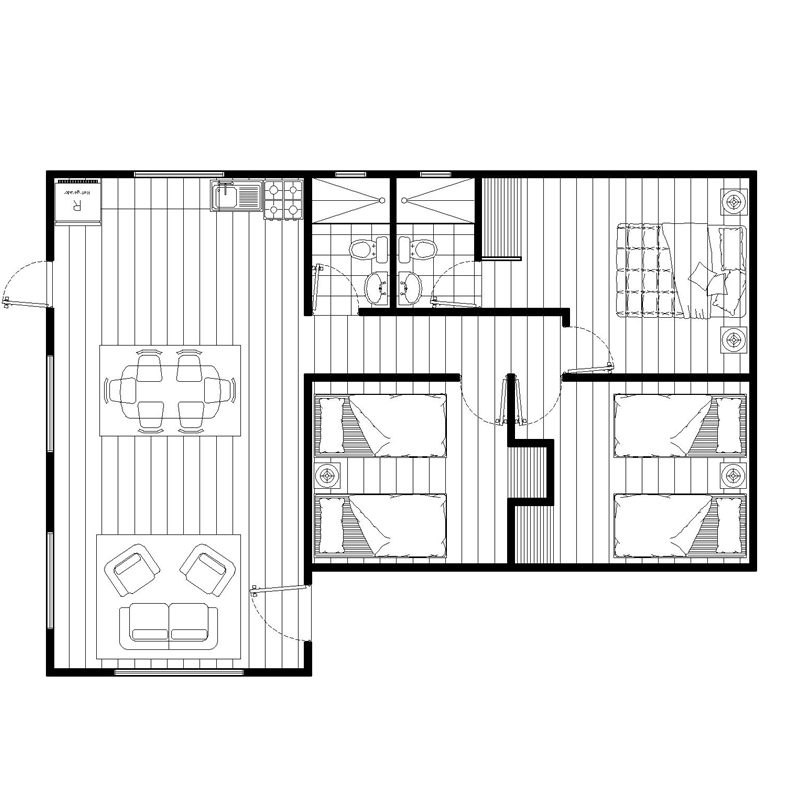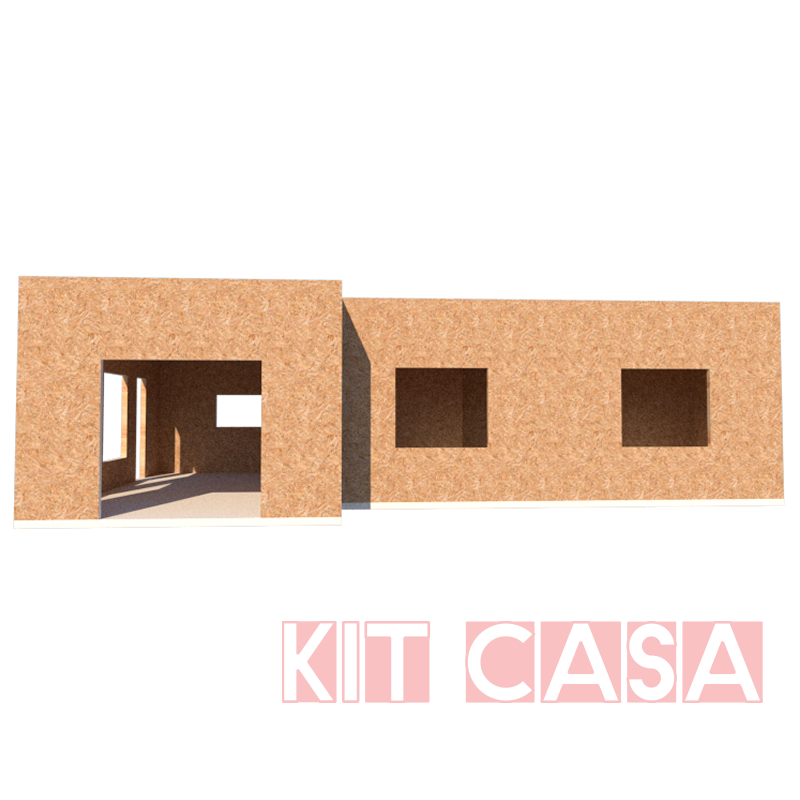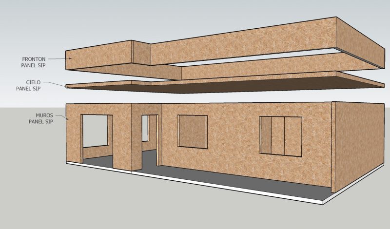 - Muros exteriores e interiores en Panel Sip de 94mm (OSB(9.5mm) +EPS (75mm)+OSB(9.5mm)) para madera de 2×3 en bruto
